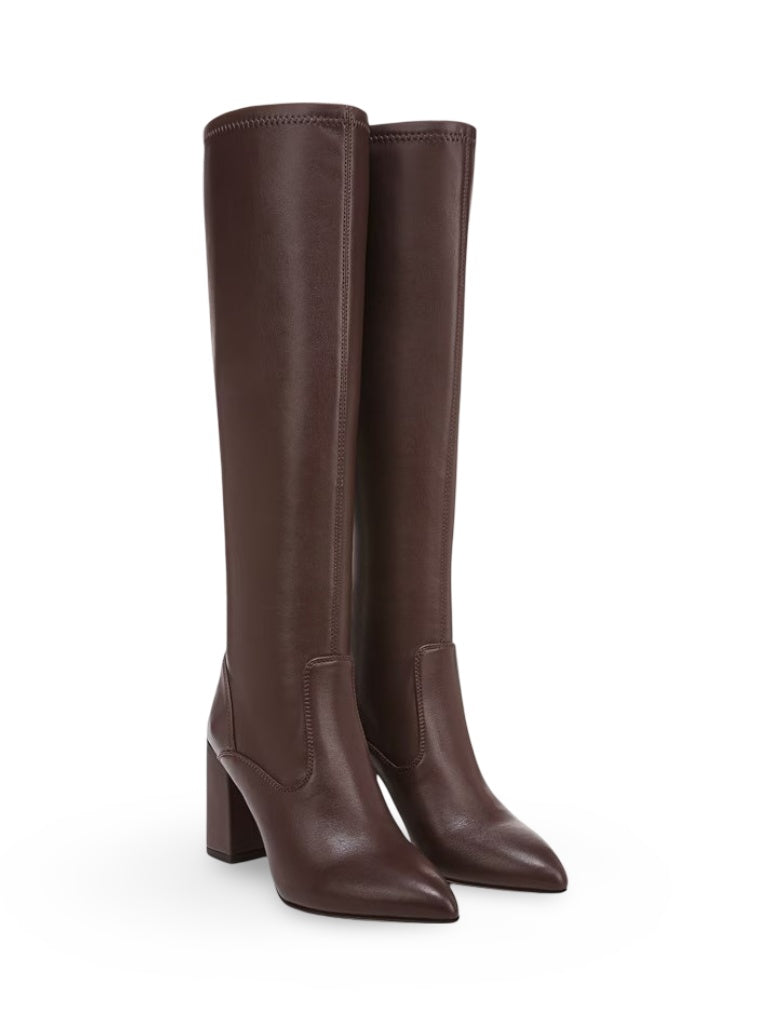 Step into style with these sleek knee-high boots, featuring stretch suede or Nappa leather uppers made with responsibly sourced materials. Enjoy eco-conscious comfort with partially recycled linings. The back-zip closure ensures easy wear, while metallic heel detailing and a pointed toe add a touch of sophistication. With a 15.25-inch shaft height, these tall boots make a bold statement.