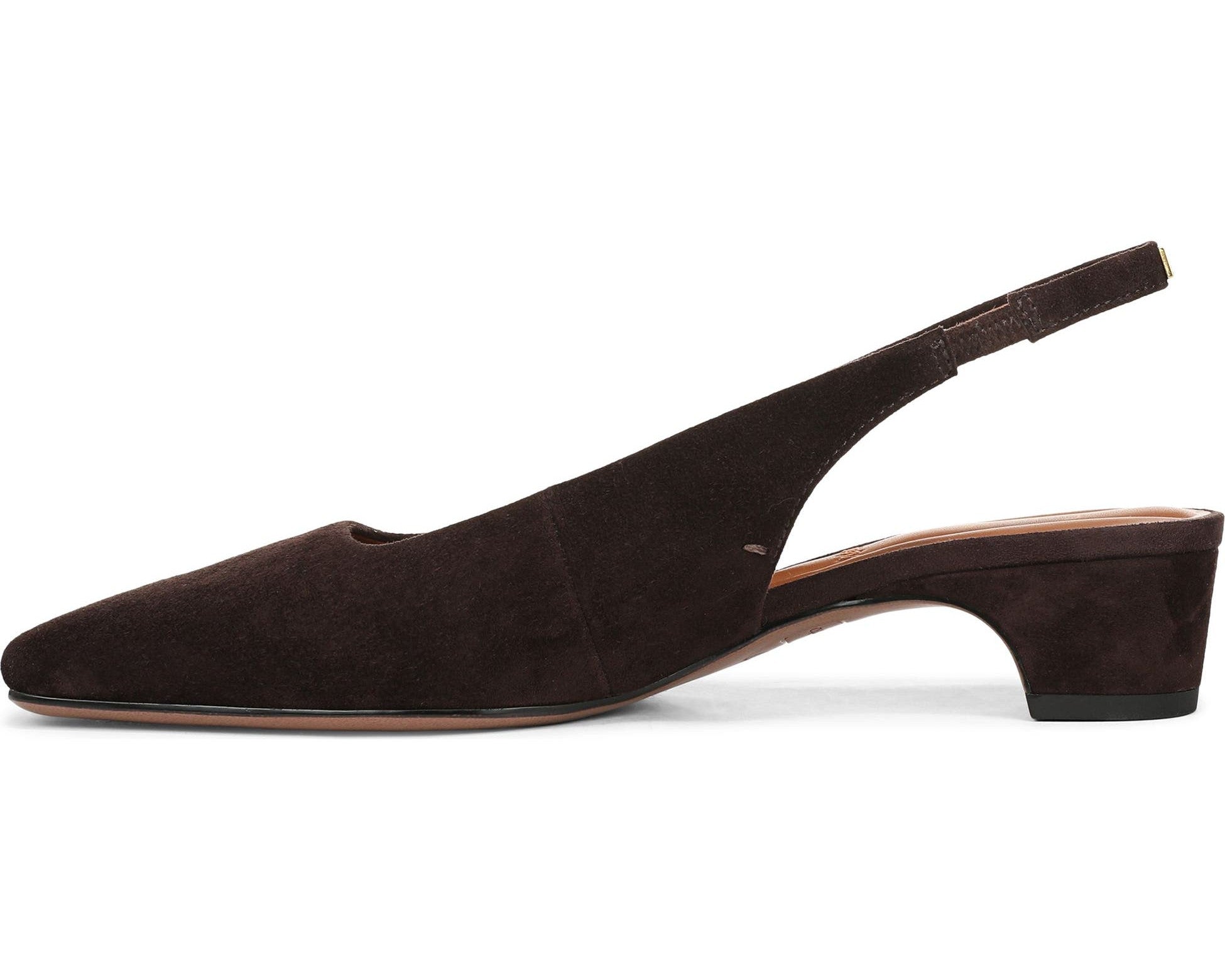 This pump embodies vintage charm with its softly squared toe and slender slingback, elegantly paired with a comfortably low heel, making it a stylish and comfortable choice.