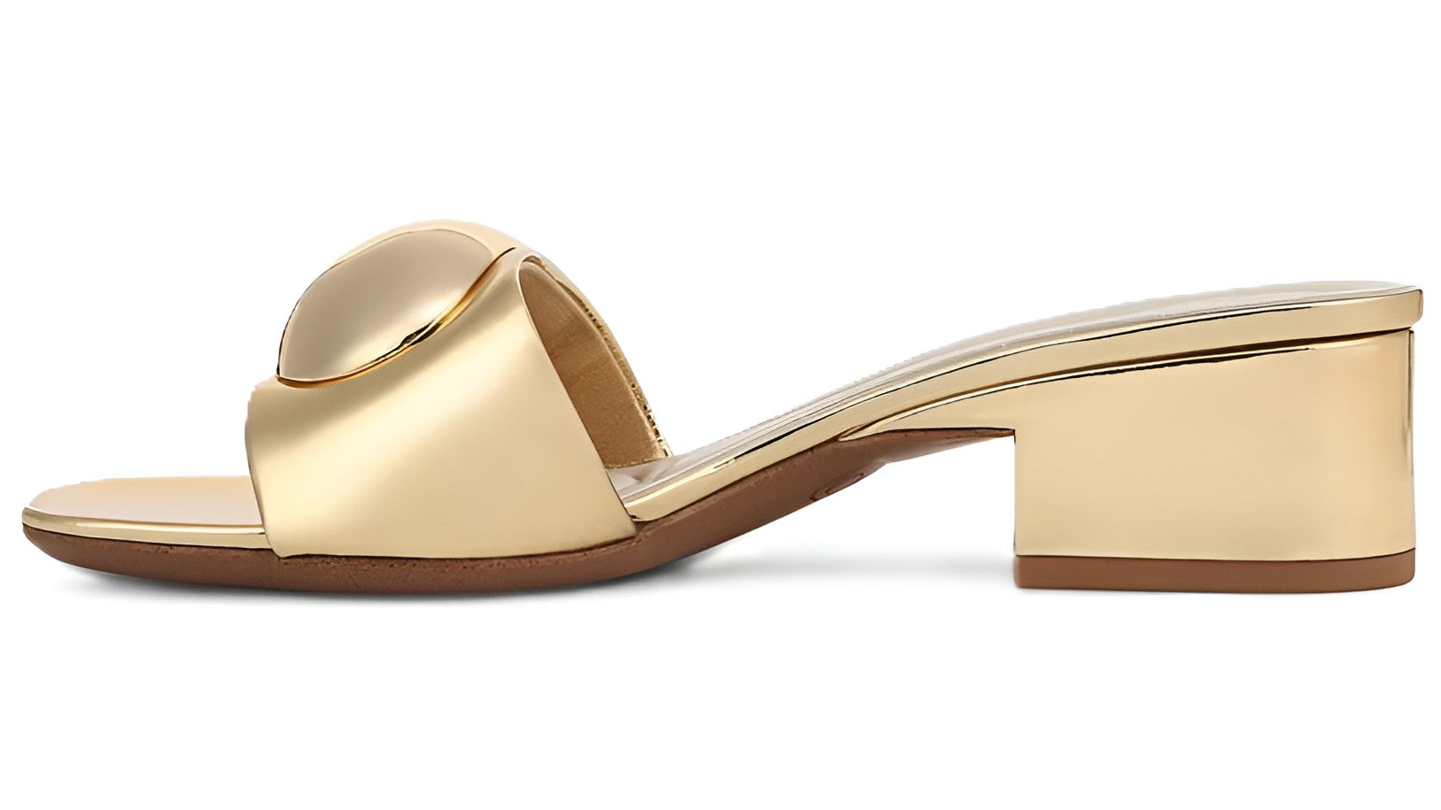 Elevate your style with these sleek sandals, featuring a leather upper and a show-stopping artistic metal ornament that adds a touch of sophistication.