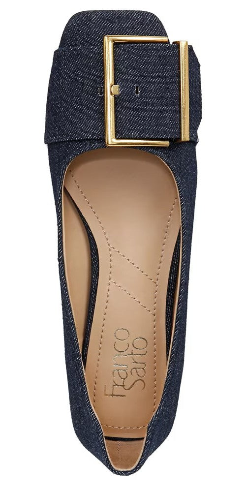 The Franco Sarto Women’s Tahlia Ballet Flat delivers sleek sophistication with its square-toe silhouette and chic fold-over buckle detail. Crafted with a slip-on design and either a fabric or synthetic leather upper (partially made from recycled materials), it combines elevated style with eco-conscious comfort. A block heel of approximately 1.00 inch provides subtle lift while maintaining all-day wearability. This flat seamlessly transitions from office to weekend, offering both visual polish and dependable ease.