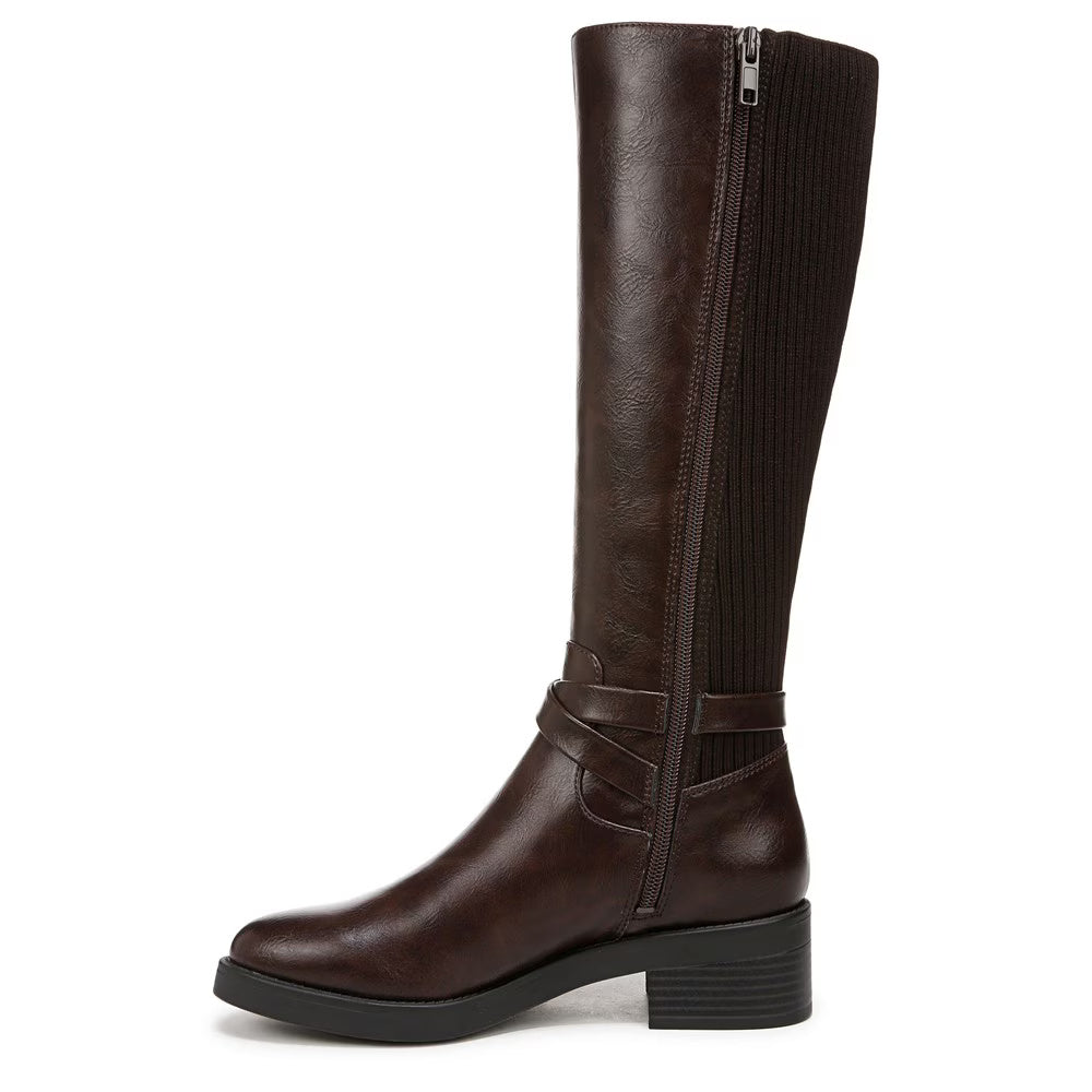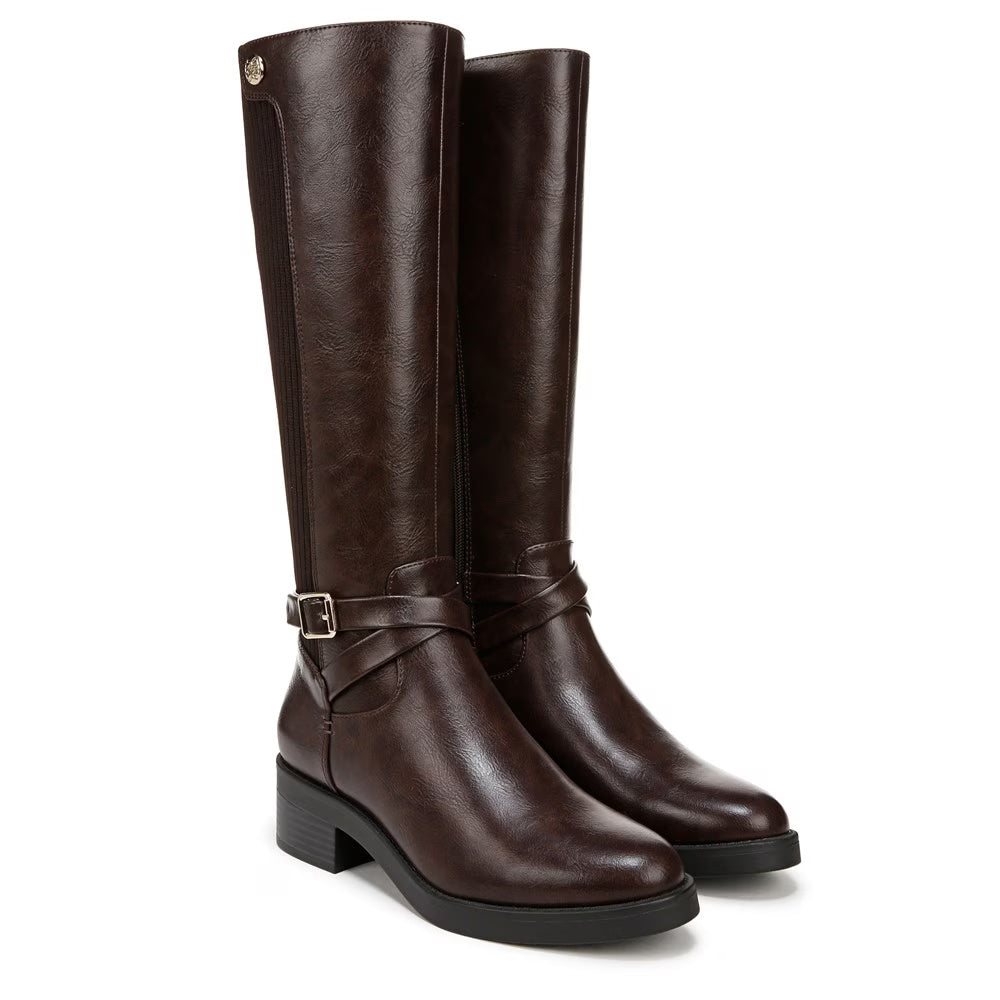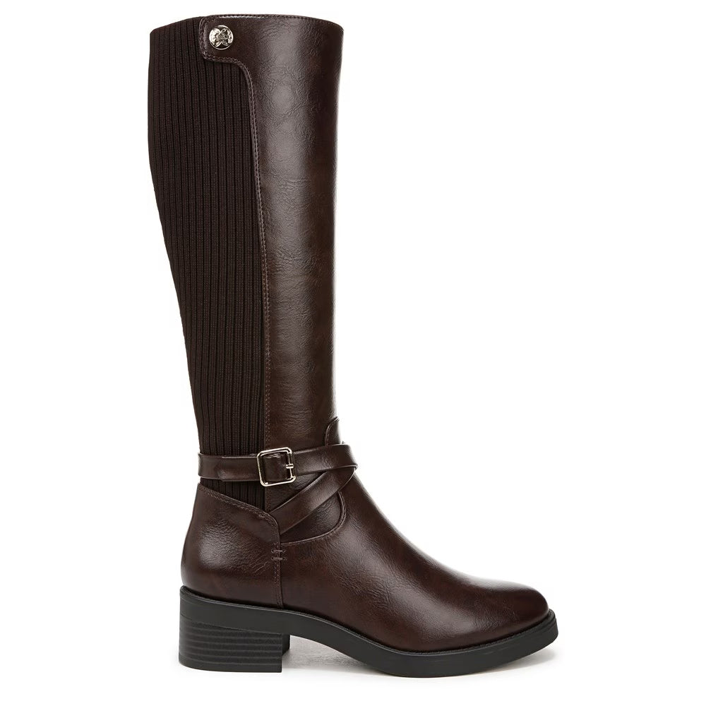 Step out in style and comfort with these women’s tall riding boots featuring a faux leather upper, decorative buckle accents, and a stretch knit back panel for a flexible fit. Designed with an easy inside zipper and Soft System® cushioning, these boots offer all-day wearability and timeless style.