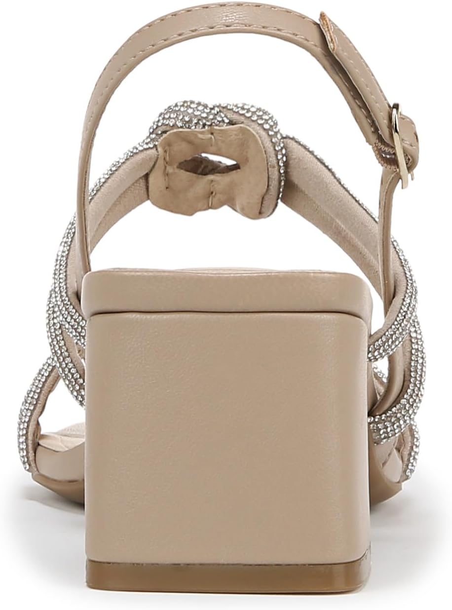 Sparkle, but make it chic in these stunning women's block heels with soft, rhinestone-studded straps. Perfect for weddings and special occasions. Slingback heels designed with faux leather, an open square toe, adjustable buckle with built-in stretch, and stunning knotted rhinestone straps. Linings crafted from partially recycled materials.