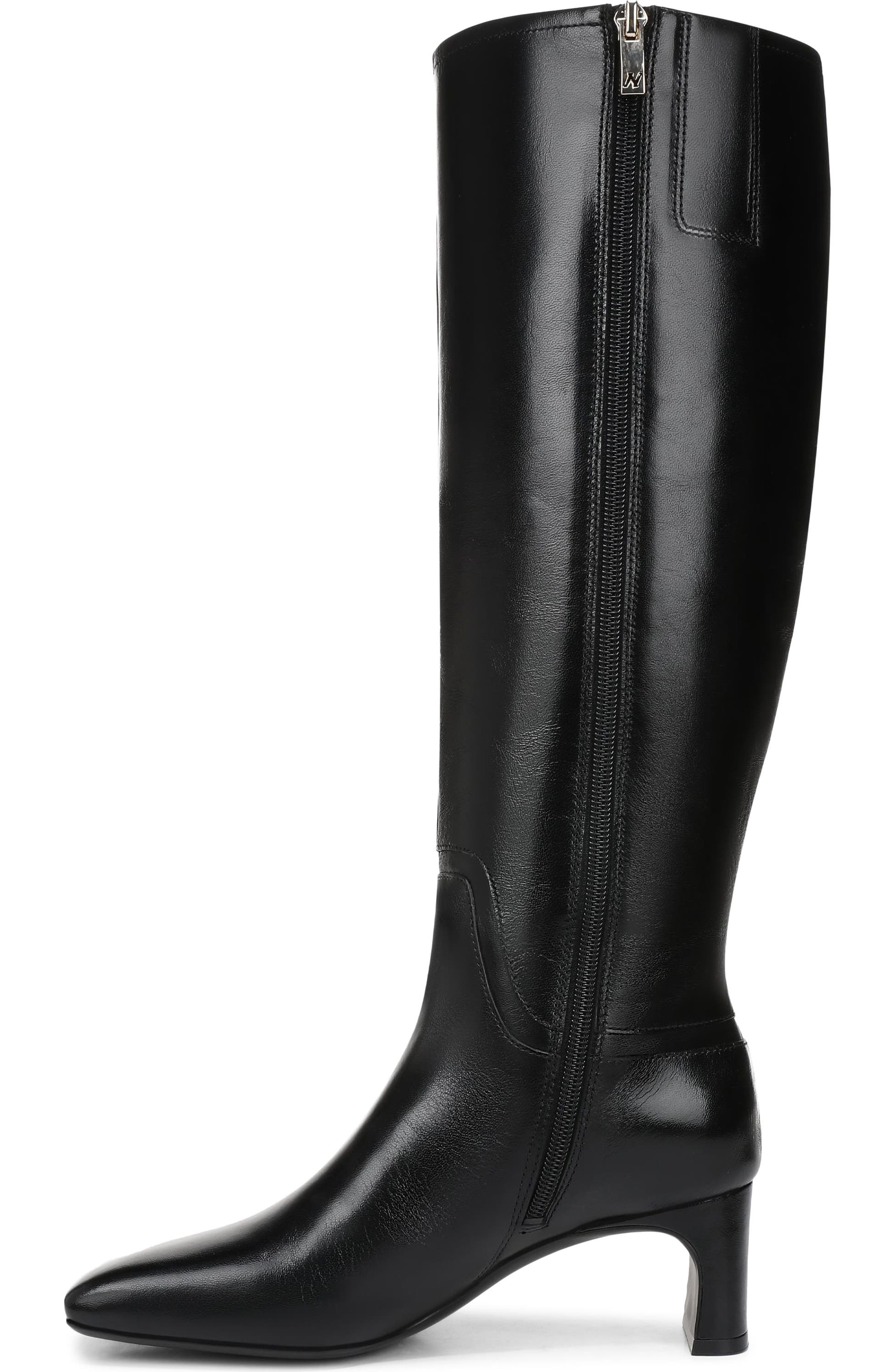 Streamlined dress boots elevated by an architectural heel and effortless comfort. Knee-high boot with sculpted blade heel and stitch detail.