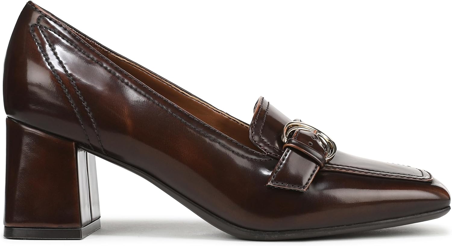 Your office hero. This polished moc silhouette delivers cushioned confidence from desk to dinner. Loafer-inspired pump with stitch detail, durable outsole, and buckle detail.