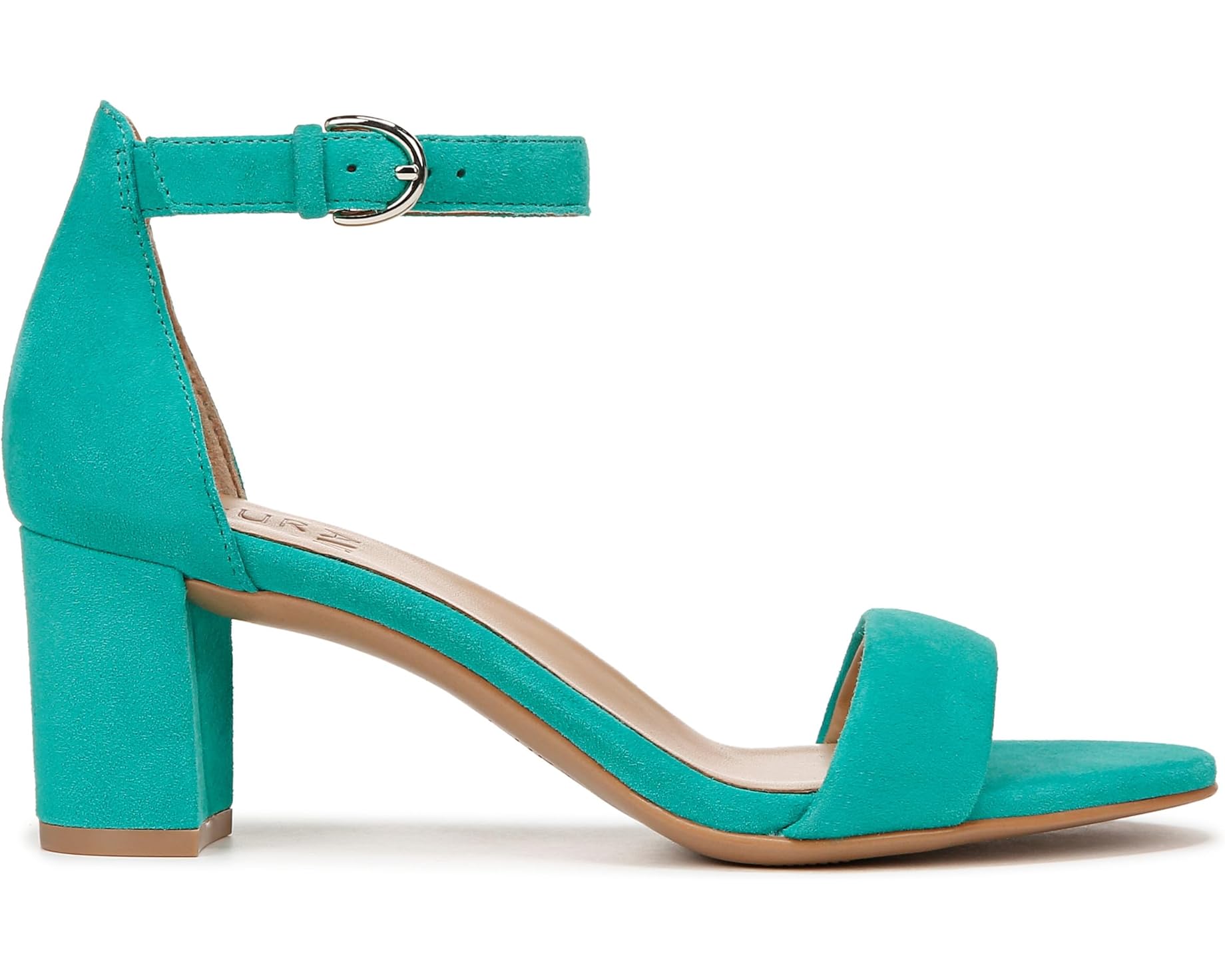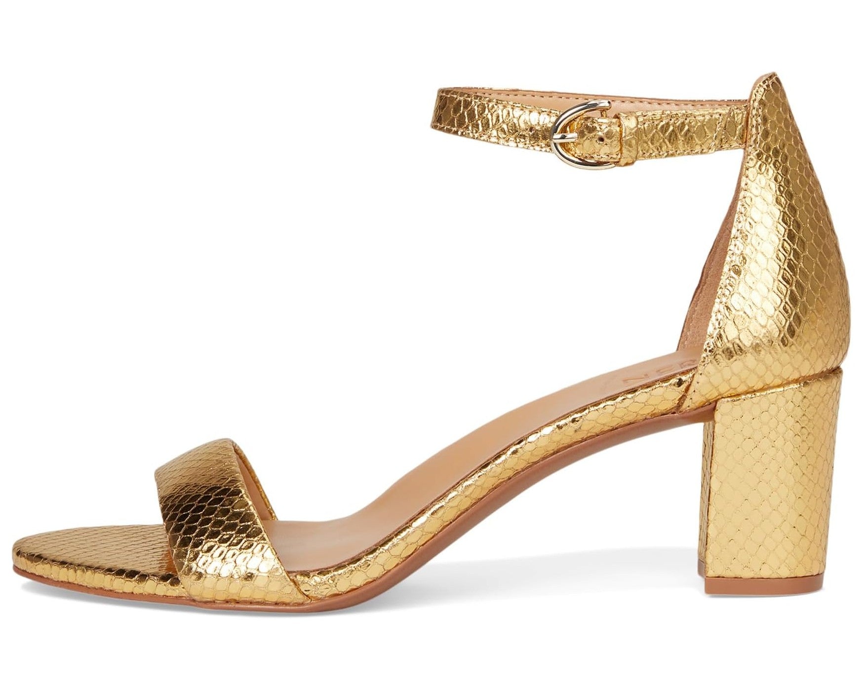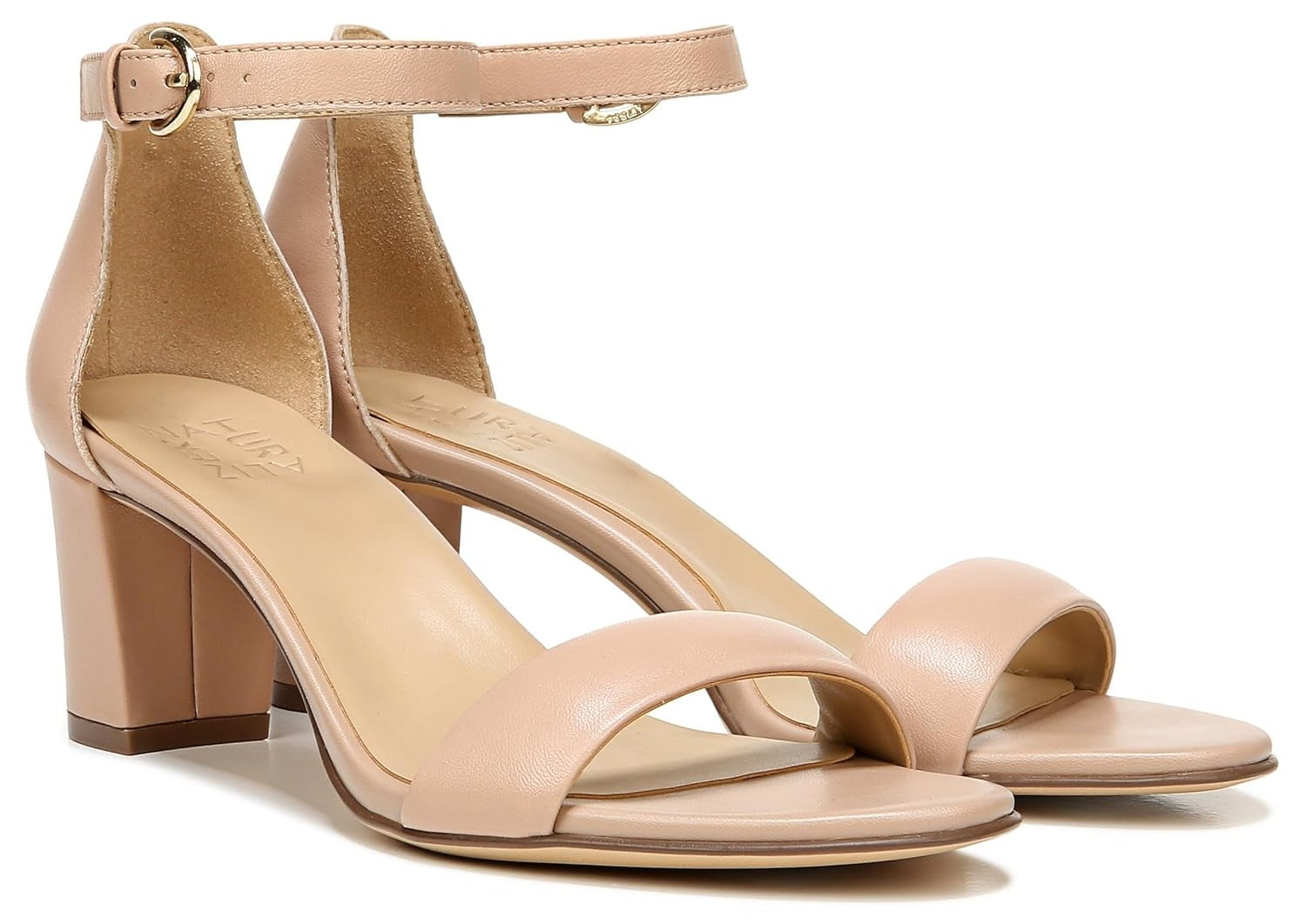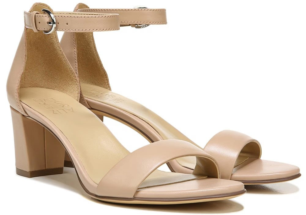 Get there beautifully. Minimal block heel sandal with slender ankle strap, a woven or smooth toe strap and all-day comfort.
