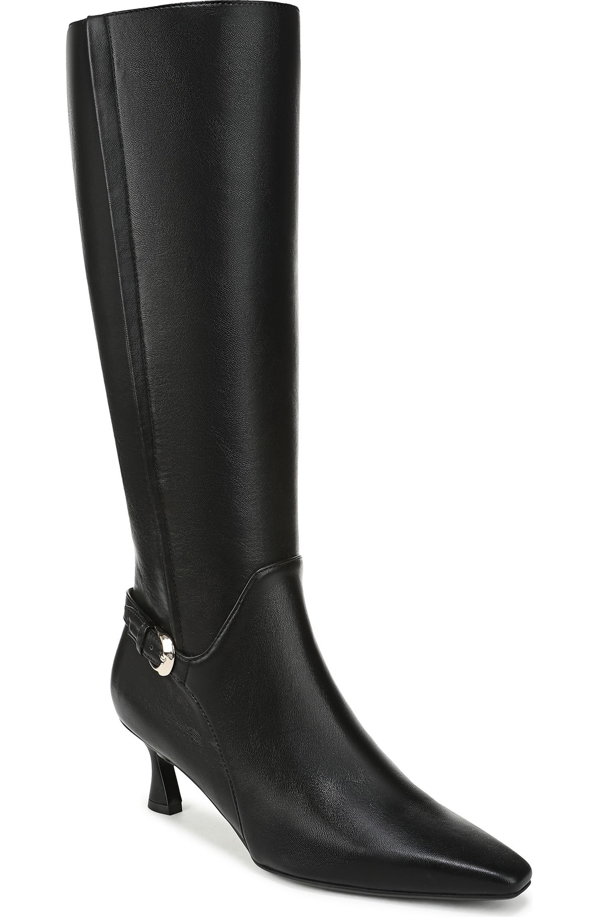 Dial up your dressy look with these striking tall boots, designed with sculptural style and elevated cushioning. Featuring a sleek faux leather upper, snip toe, stitch detailing, and a decorative buckle, they bring polished sophistication to any outfit.