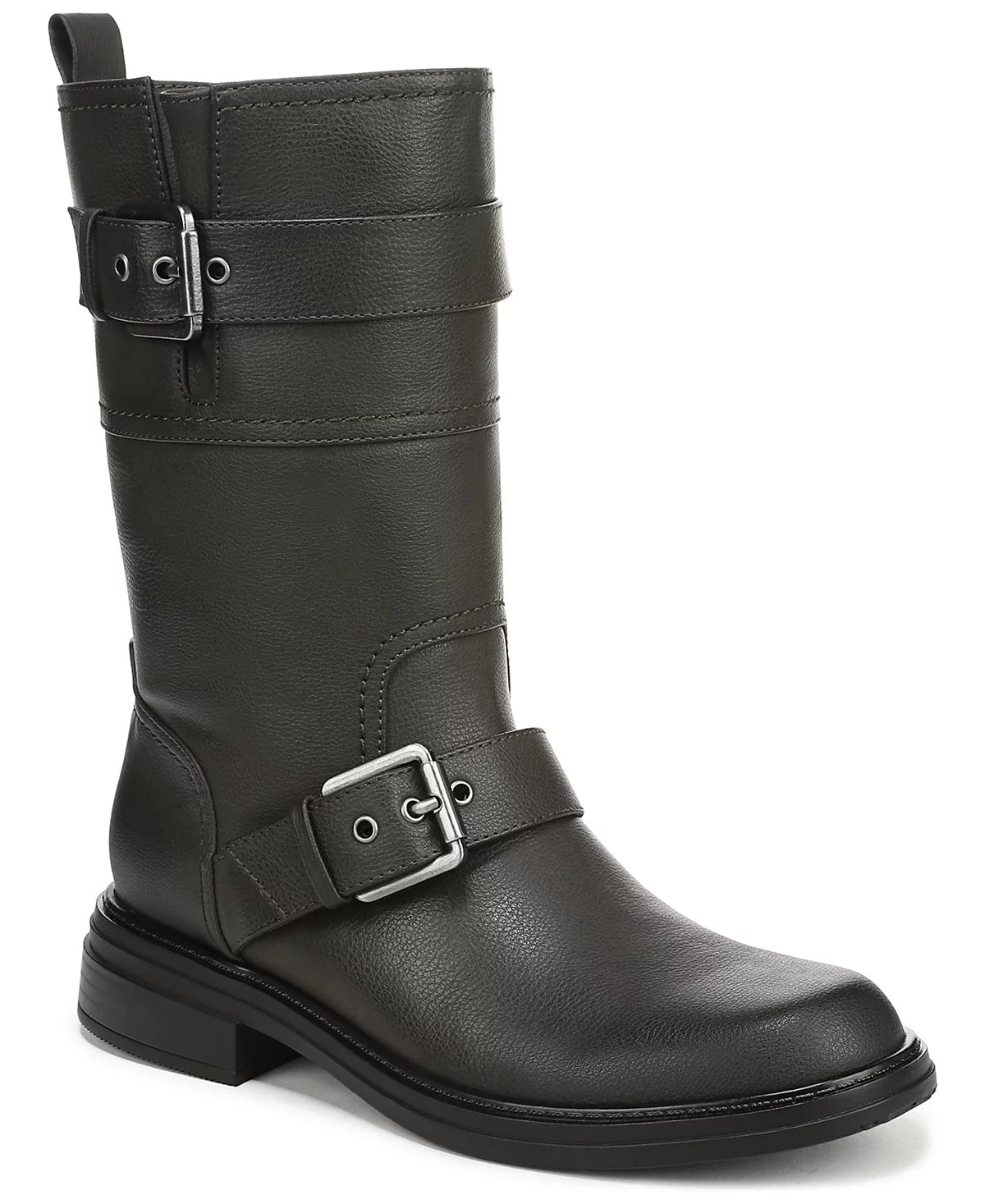 Get that edgy moto look with this mid-calf boot, featuring bold buckles, sleek faux leather, and Contour+ Comfort tech for all-day comfort. Perfect blend of style and comfort!