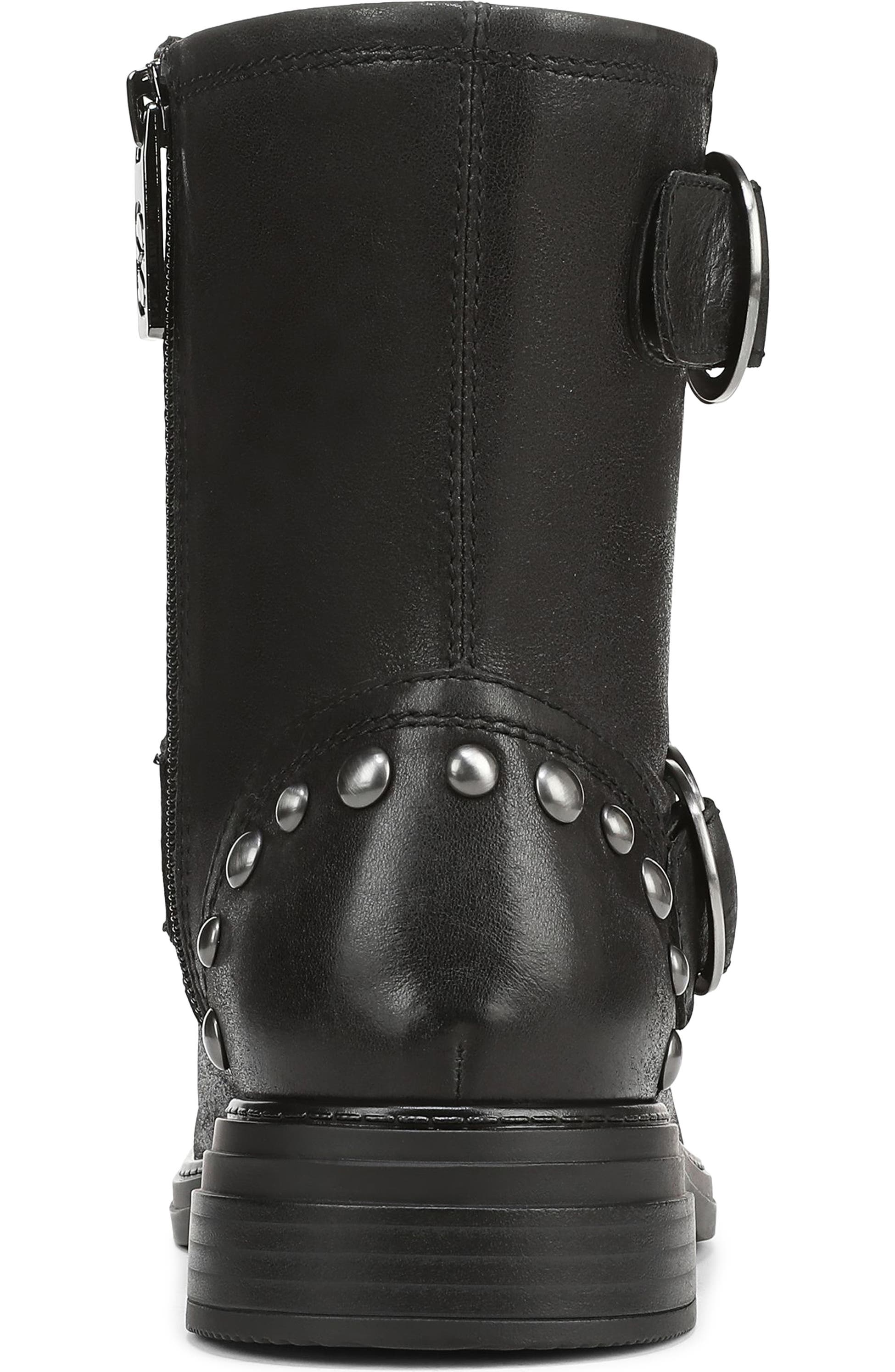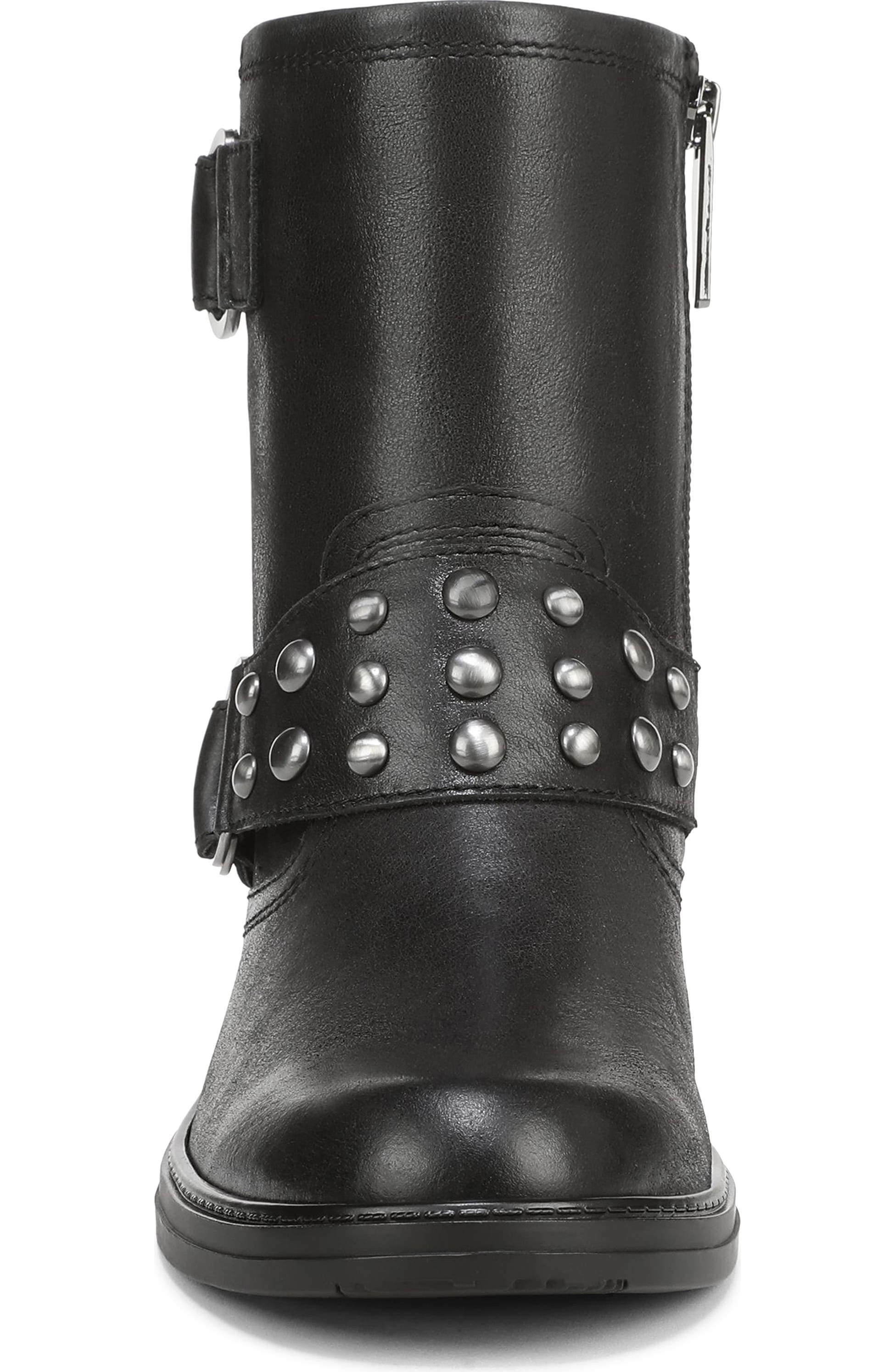 Step into sleek street style with this moto-inspired mid-calf boot, featuring a studded leather strap, bold buckles, and western-inspired stitching. Crafted with a round-toe leather upper and side zip, it’s finished with Contour+ Comfort technology and a 1 3/8" block heel for all-day ease.