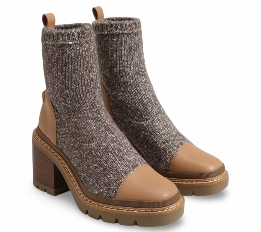 The Rozanna Knit Bootie combines knit and leather for a trendy, mixed-media design. Featuring a sturdy lug sole, this bootie keeps you grounded and stylish. Perfect for any occasion, with a comfortable 3.4" heel and versatile rounded toe.