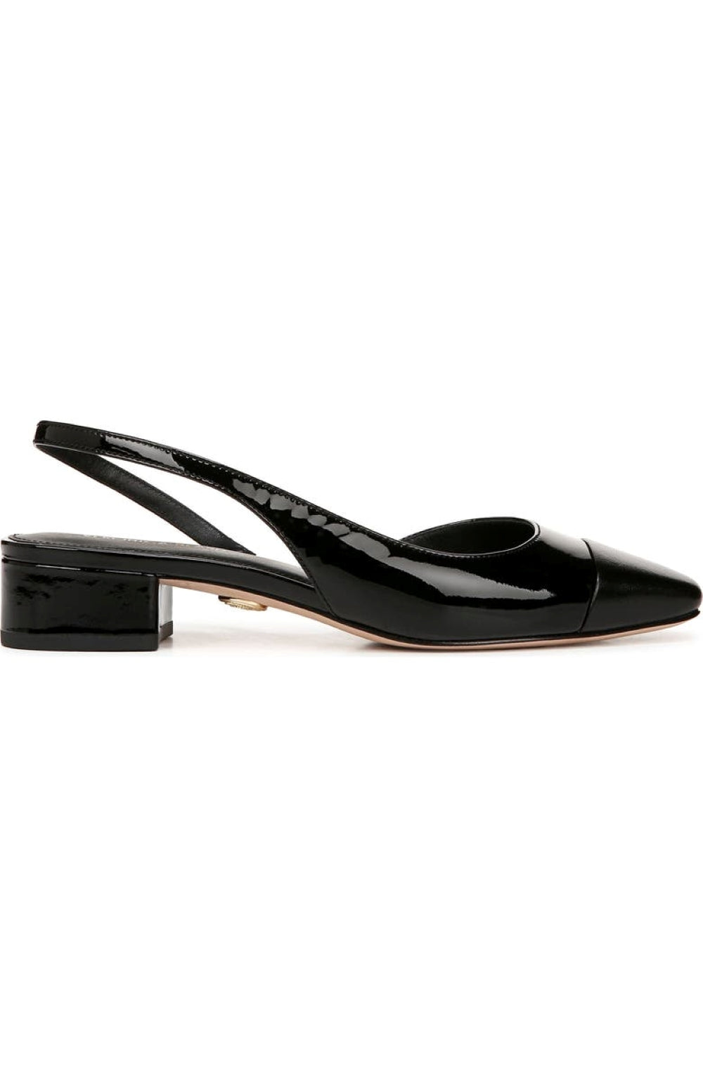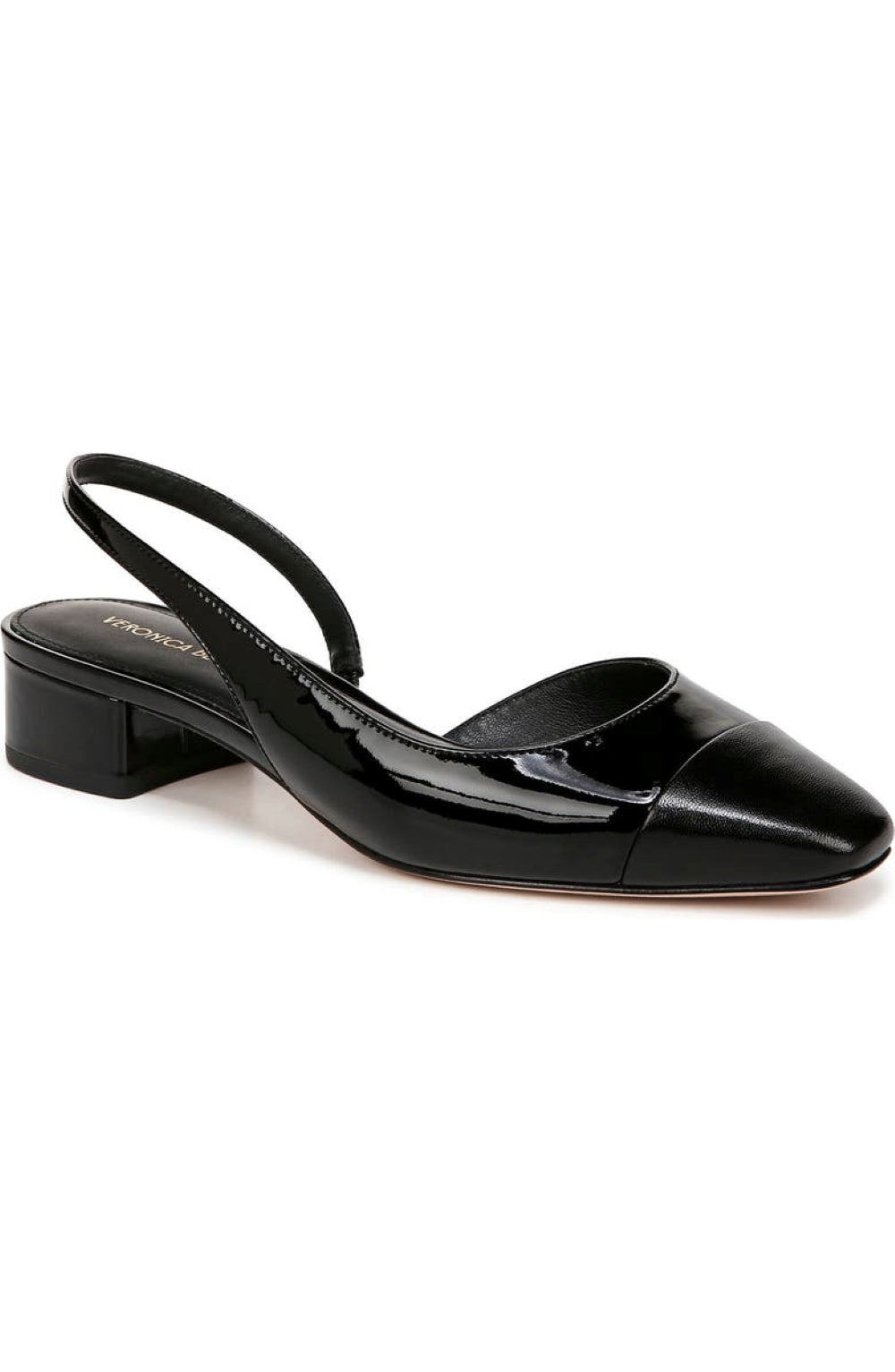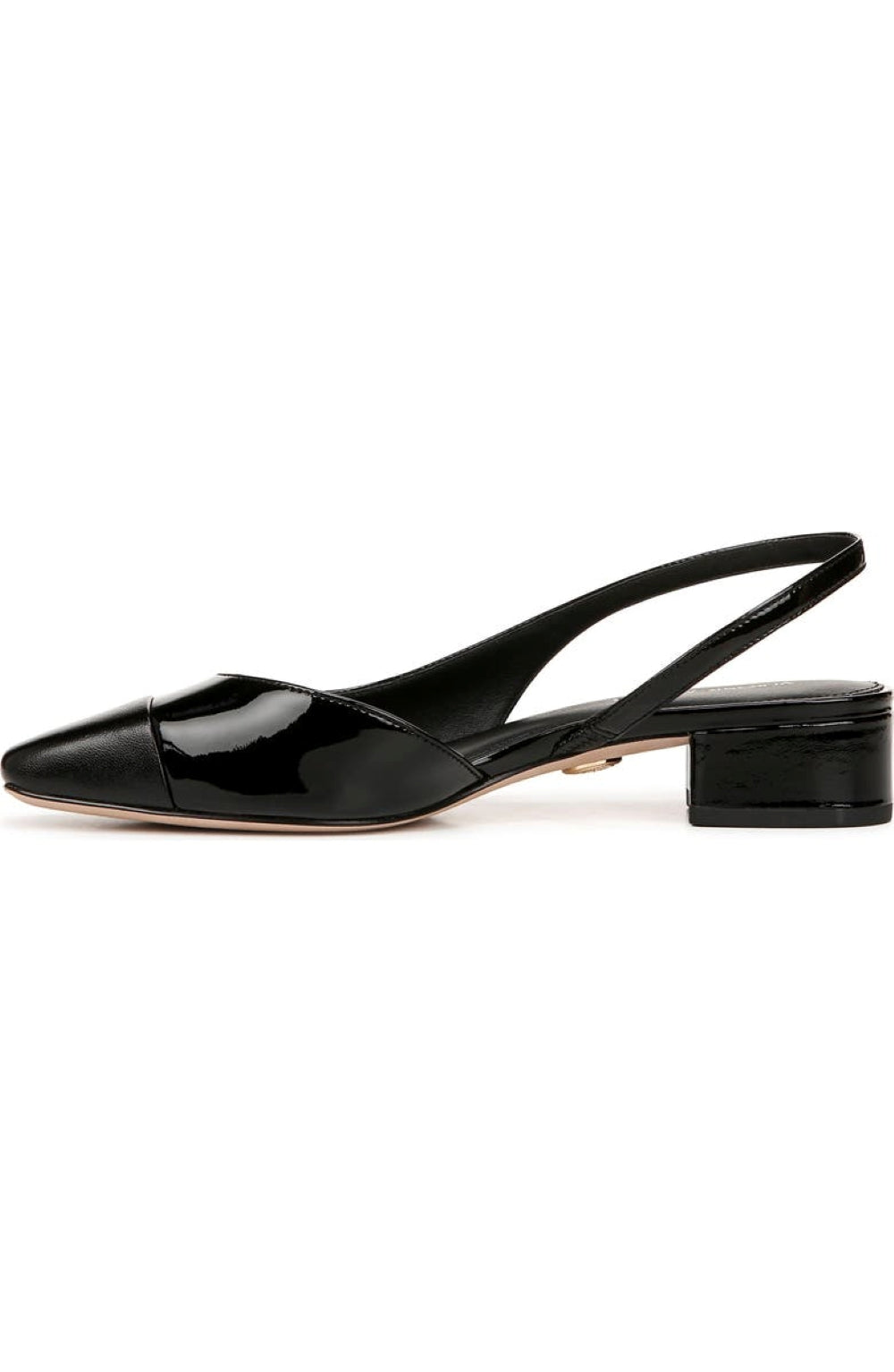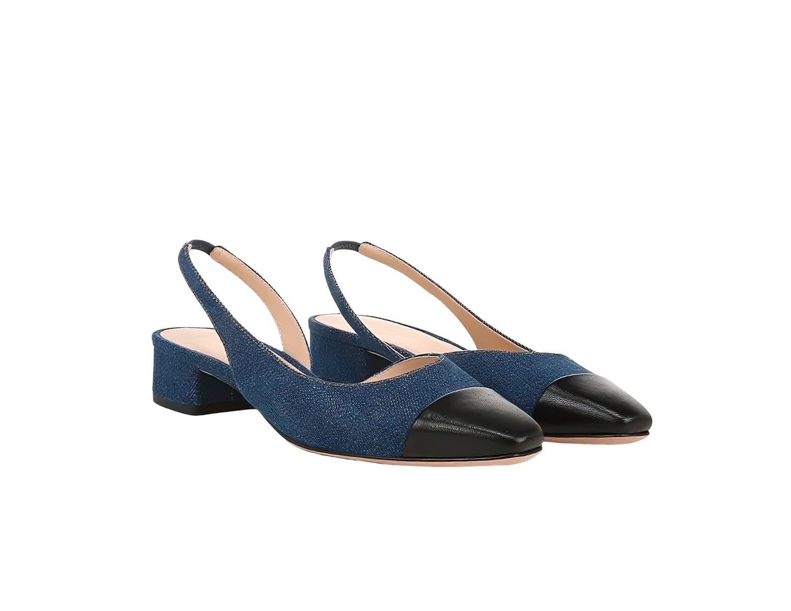Introducing the Cecile, our modern interpretation of the timeless cap-toe slingback. Meticulously fashioned from glossy leather, this chic color-blocked design showcases a sleek tapered square toe, a practical one-inch block heel for added stability, and an elasticized strap for enhanced comfort. Perfectly complement your casual ensemble by pairing it with jeans and a crisp button-down for an effortlessly polished look.