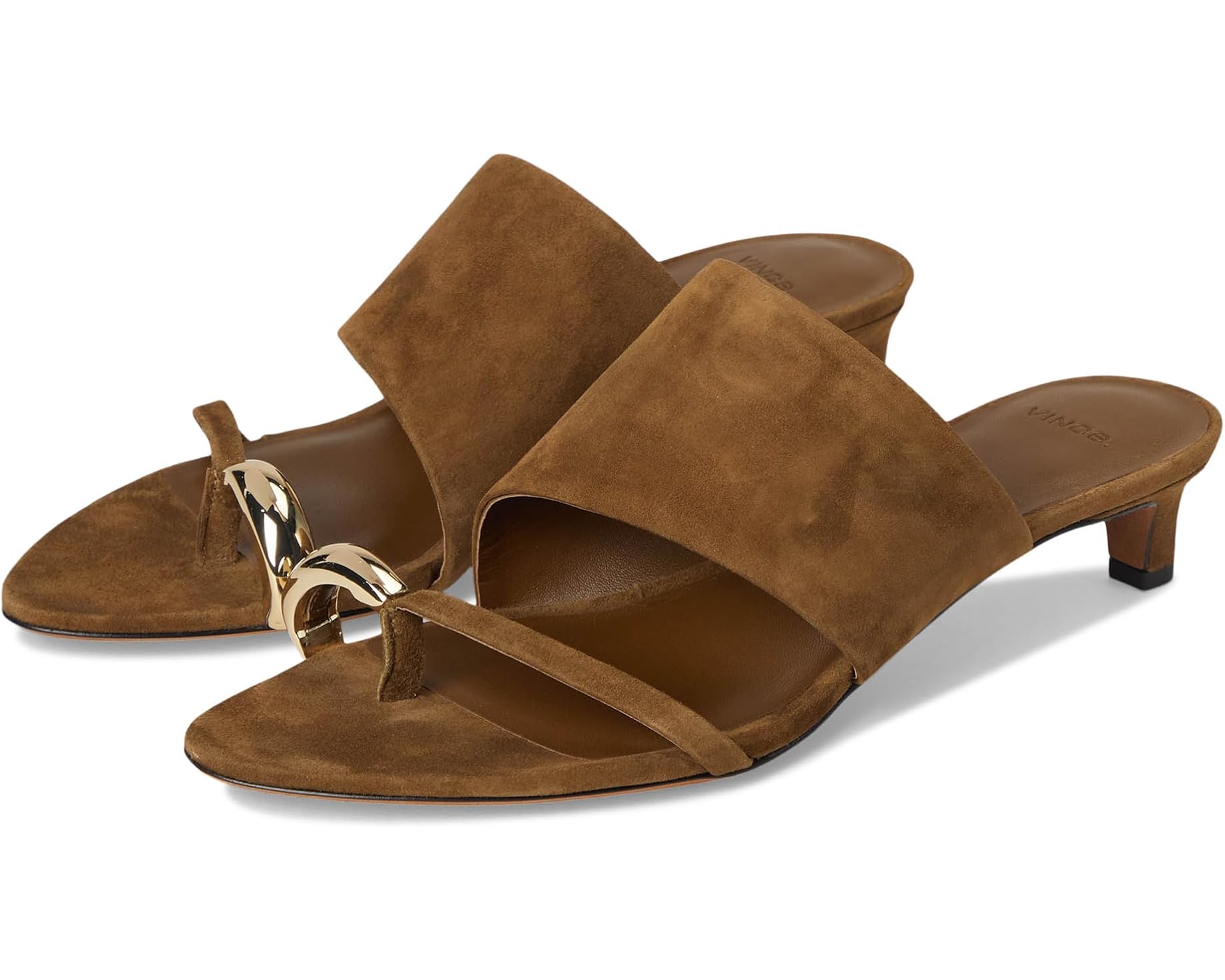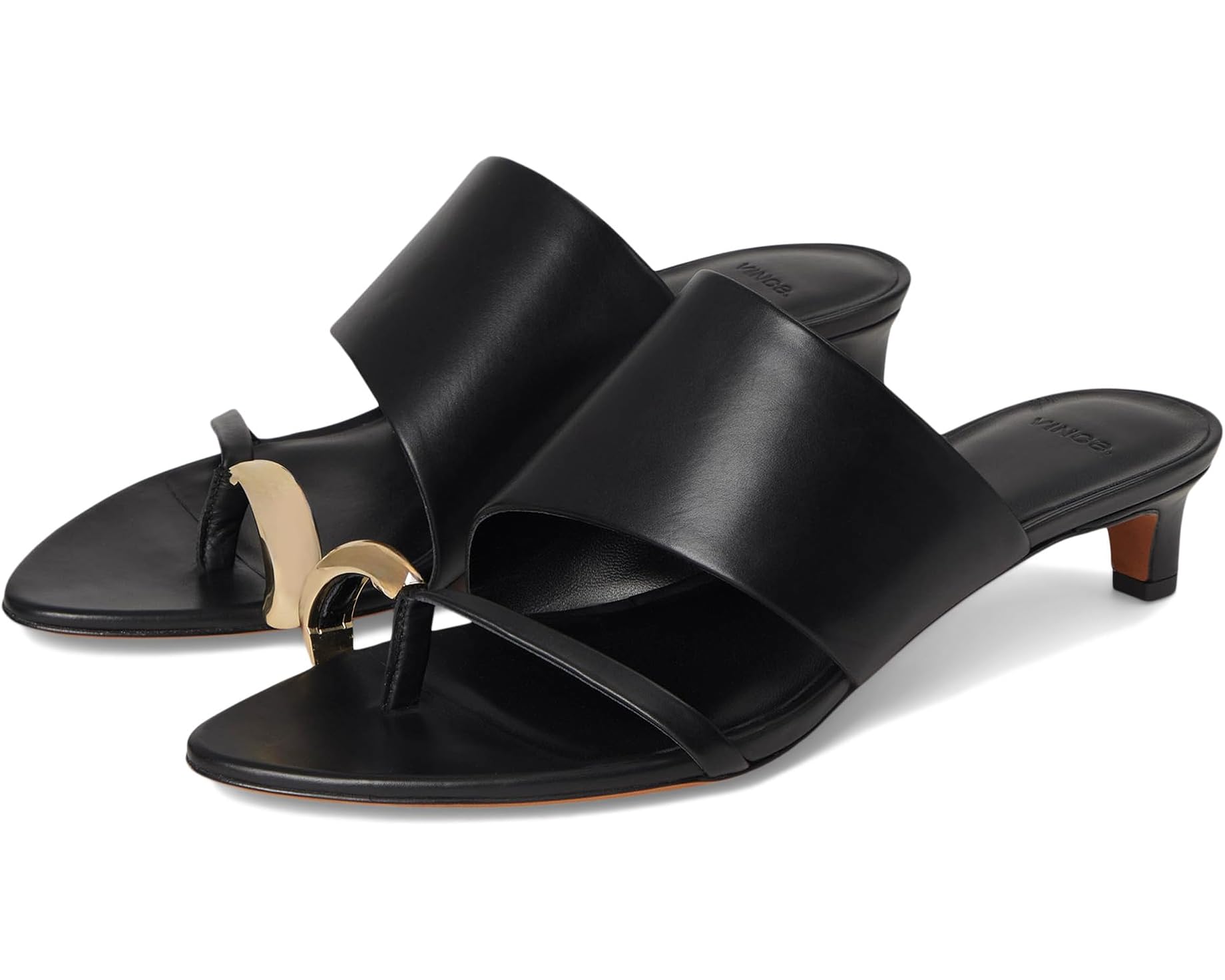 Set on a low 1.5 inch sculptural kitten heel, this supple leather sandal creates a modern, artful look through its mix of wide and slender straps. The open toe design is elevated with a gold tone metal ring that adds a refined, jewelry inspired accent. Slip on construction keeps the fit effortless while the soft leather provides a comfortable feel for all day wear. With its sleek proportions and minimalist silhouette, this sandal brings polished style to any warm weather outfit.