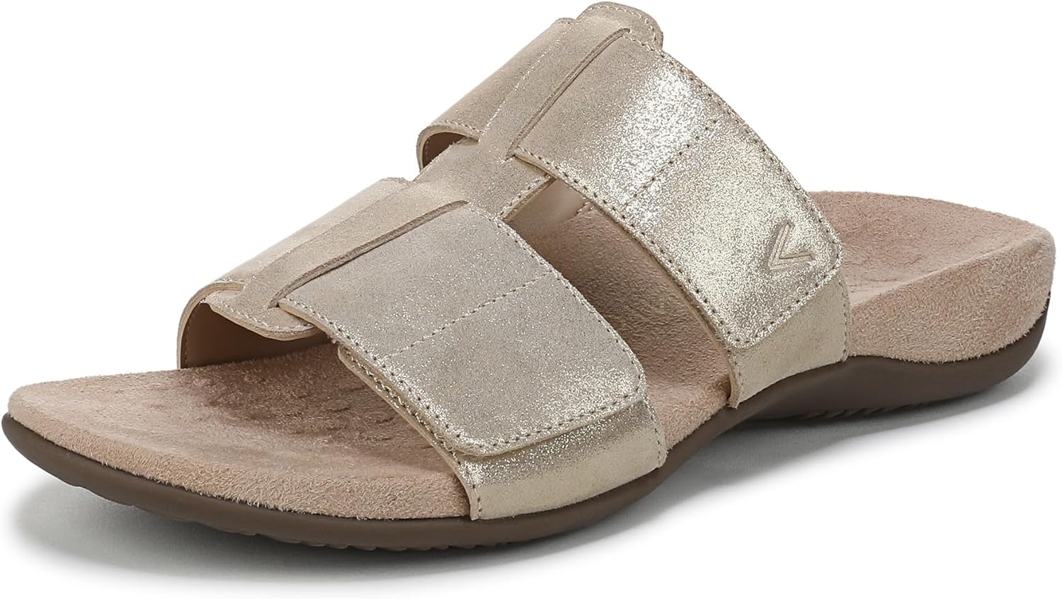 Step into summer with ease in these Vionic leather slide sandals, featuring adjustable hook-and-loop closures, contoured arch support, and shock-absorbing cushioning for all-day comfort. Perfect for boardwalks, barbecues, or just lounging around.
